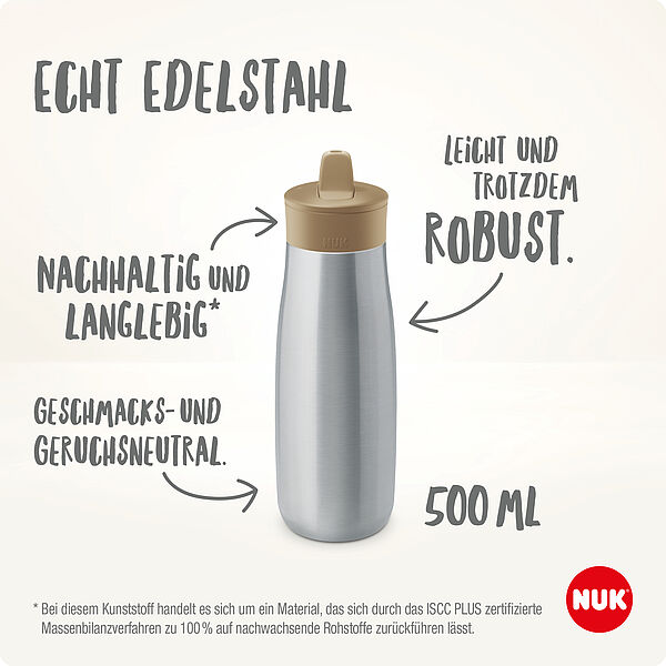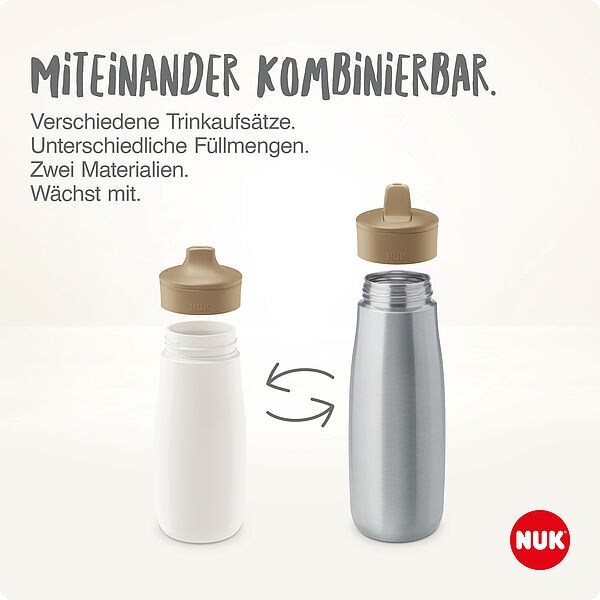 Endlich gibt es eine Trinkflasche, die all deine Erwartungen erfüllt. Sie versorgt dein Kind verlässlich mit Flüssigkeit und bietet noch so viel mehr: Schönes, minimalistisches Design, das nicht nur Kindern gefällt. Hochwertige, nachhaltige Materialien wie Edelstahl und Kunststoff aus natürlichen Rohstoffen.¹ Verschiedene innovative Trinkaufsätze. Verschiedene Füllmengen. Frei kombinierbar. So seid ihr bereit für jedes Abenteuer.