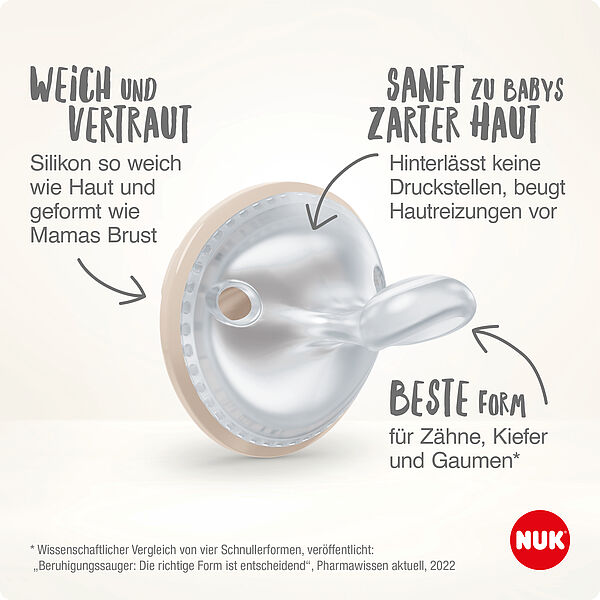 Die Stillbeziehung zwischen Baby und Mama ist wertvoll und sensibel. Darum wurde der neue NUK MommyFeel ganz speziell gestaltet. Damit er beruhigt, ohne die Stillbeziehung zu beeinflussen. Der Sauger ist geformt wie Mamas Brust. Und das Silikon, aus dem er besteht, ist so weich wie Haut. Für ein Gefühl wie bei Mama. So ist der NUK MommyFeel die beste Wahl für eine intakte Stillbeziehung.