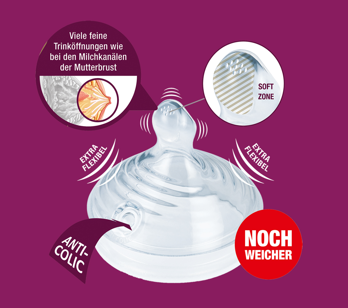 „Damit ein Fläschchen das Stillen so wenig wie möglich stört, sollte der Trinksauger vor allem eins sein: ganz weich. Gewöhnt sich ein Neugeborenes an einen zu festen Sauger und wird dann an die Brust angelegt, kann es vorkommen, dass der Kopf immer hin und her geht, weil es nach dem gewohnten Sauger sucht.“
